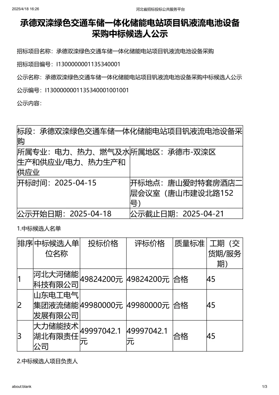 中國儲能網(wǎng)訊:4月18日,承德雙灤綠色交通車儲一體化儲能電站項目釩液流電池設(shè)備采購中標候選人公示發(fā)布。