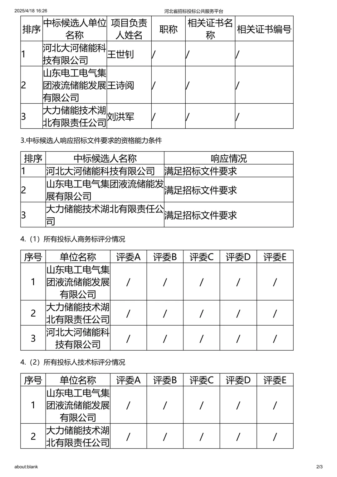 中標候選人第3名:大力儲能技術(shù)湖北有限責任公司,投標價格:49997042.1元,折合單價:2.50元/Wh。