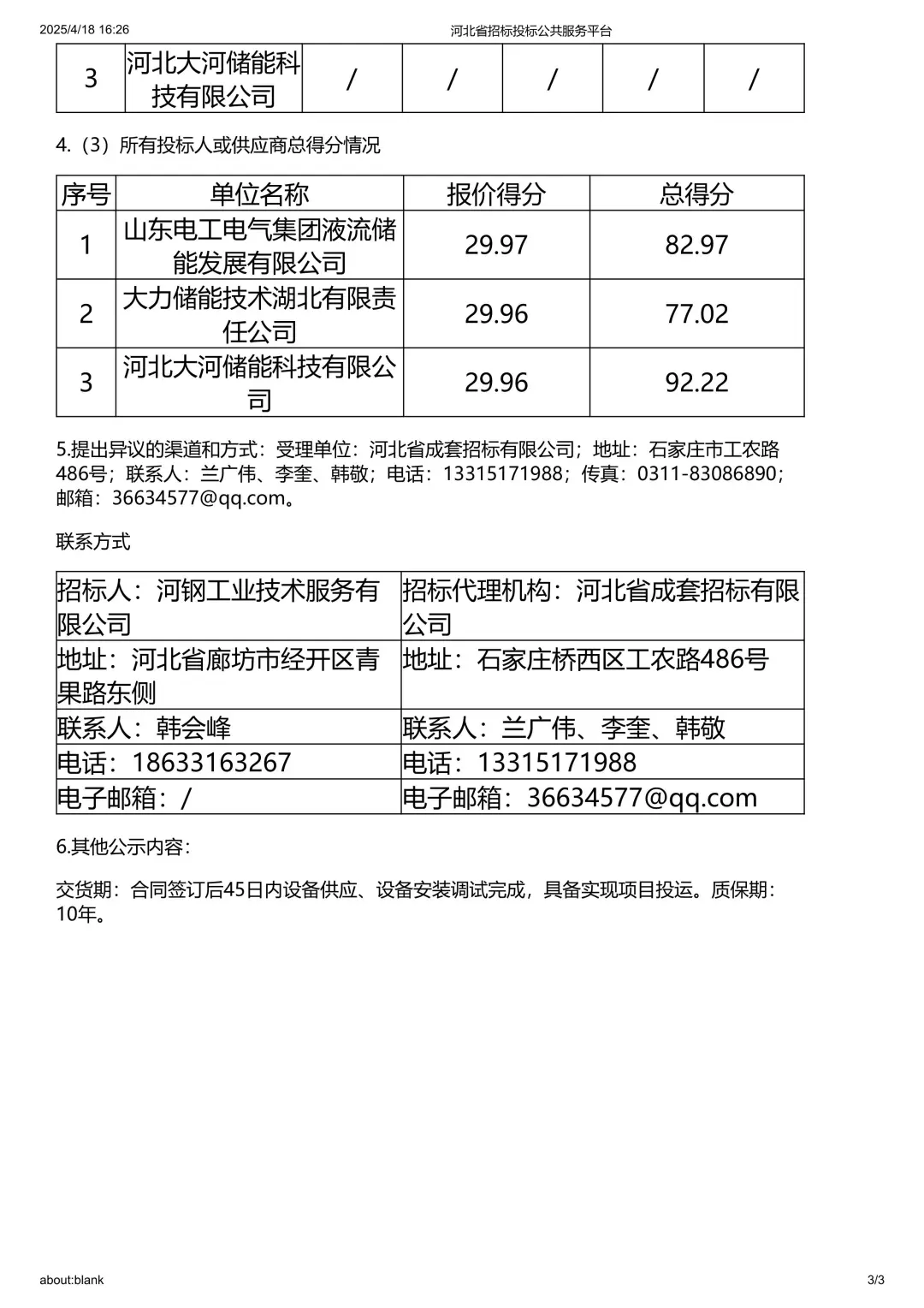 中標候選人第1名:河北大河儲能科技有限公司,投標價格:49824200元,折合單價:2.491元/Wh;