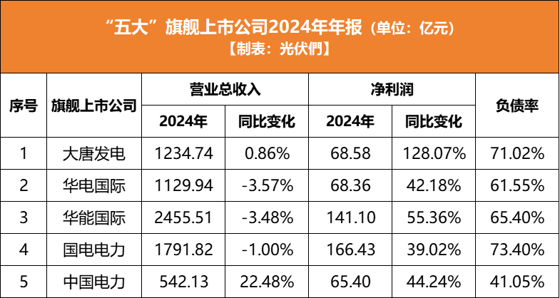 中國儲能網訊:截至本周,“五大發(fā)電集團”旗艦上市公司的2024年財報均已披露完成。光伏們從營業(yè)總收入、凈利潤、負債率三個維度統計5家上市企業(yè)2024年經營數據,如下:
