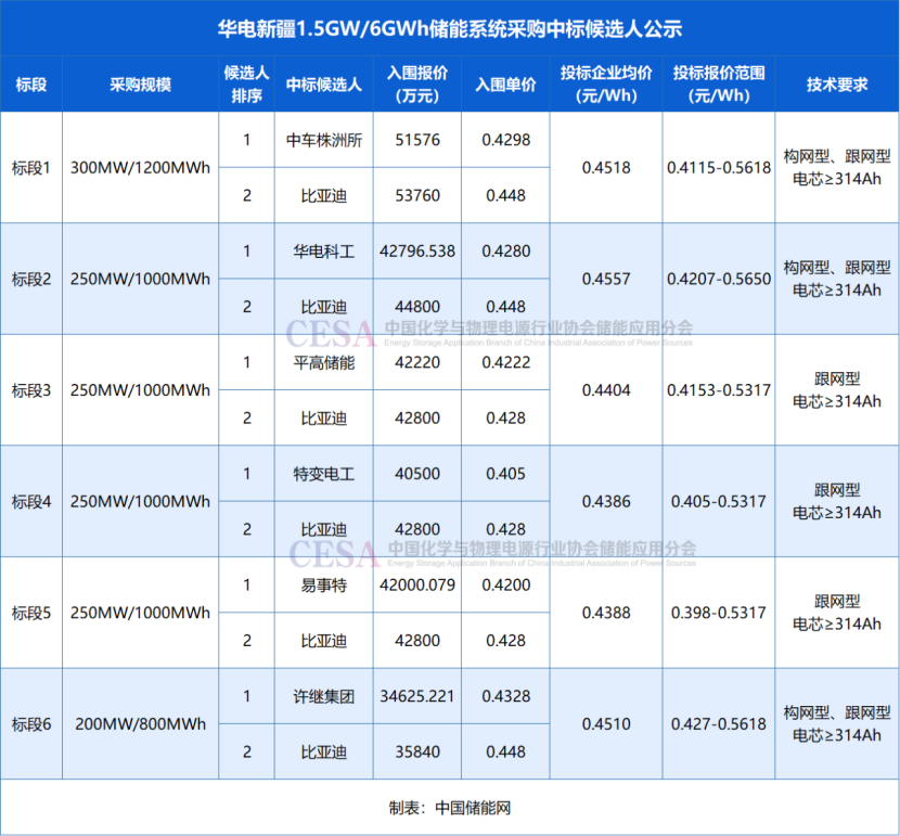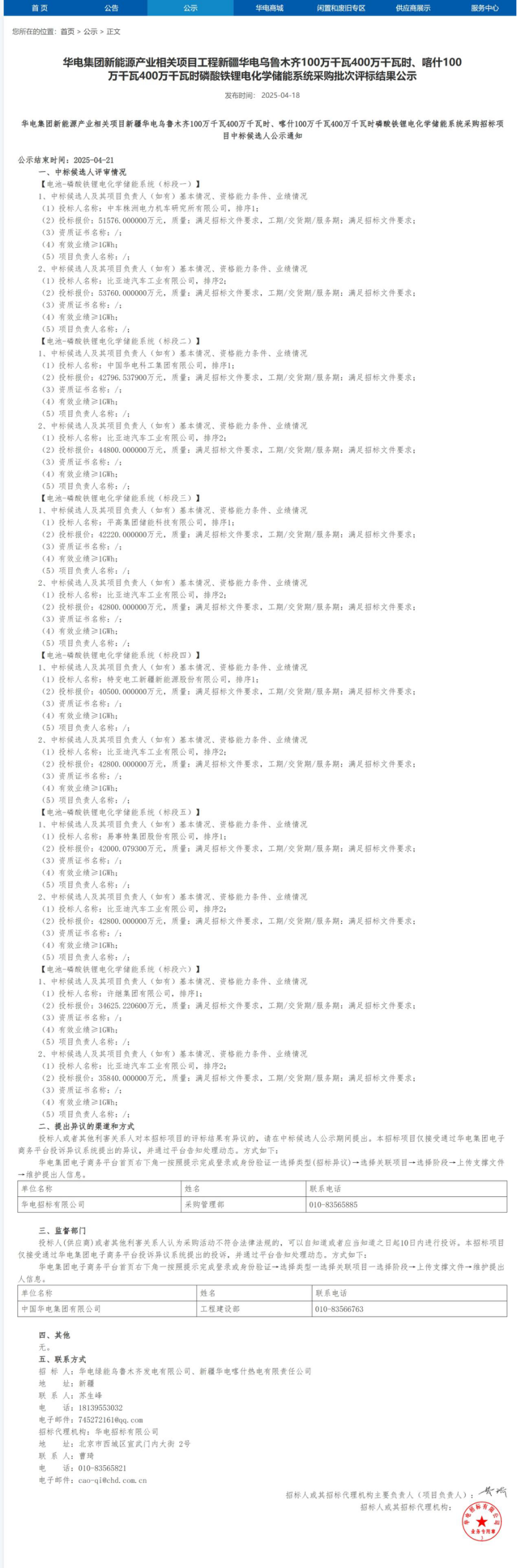 中國儲能網(wǎng)訊:4月18日,華電集團新能源產(chǎn)業(yè)相關(guān)項目工程新疆華電烏魯木齊100萬千瓦/400萬千瓦時、喀什100萬千瓦/400萬千瓦時磷酸鐵鋰電化學(xué)儲能系統(tǒng)采購批次評標(biāo)結(jié)果公示。本次采購規(guī)模共計1.5GW/6GWh,分為6個標(biāo)段,中車株洲所、華電科工、平高儲能、特變電工、易事特、許繼集團分別預(yù)中標(biāo)其中1個標(biāo)段。比亞迪為這6個標(biāo)段的第二中標(biāo)候選人。