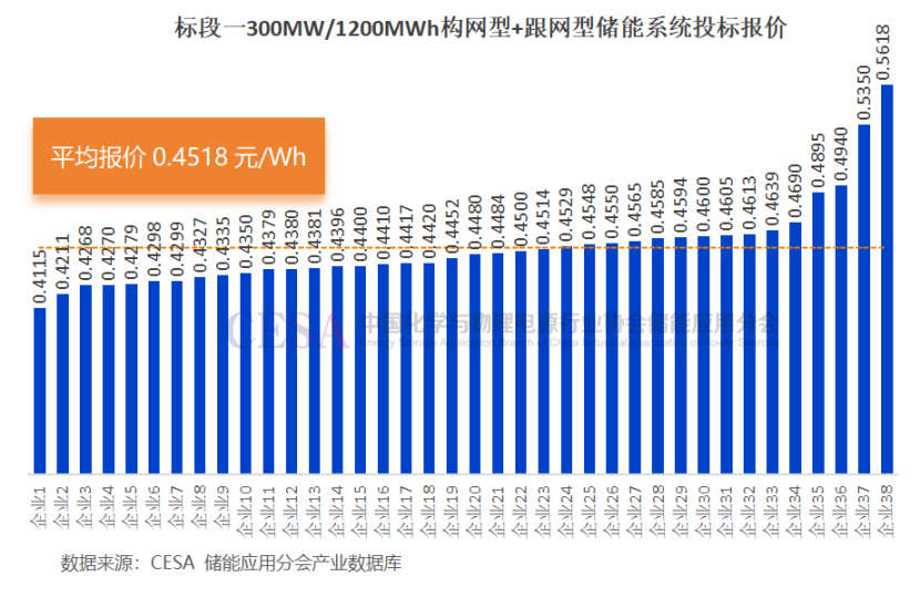 共38家企業(yè)競標(biāo),投標(biāo)報價在0.4115-0.5618元/Wh區(qū)間內(nèi),投標(biāo)均價0.4518元/Wh。
