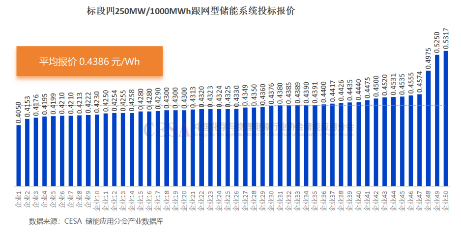 共49家企業(yè)競標(biāo),投標(biāo)報價在0.4153-0.5317元/Wh區(qū)間內(nèi),投標(biāo)均價0.4404元/Wh。