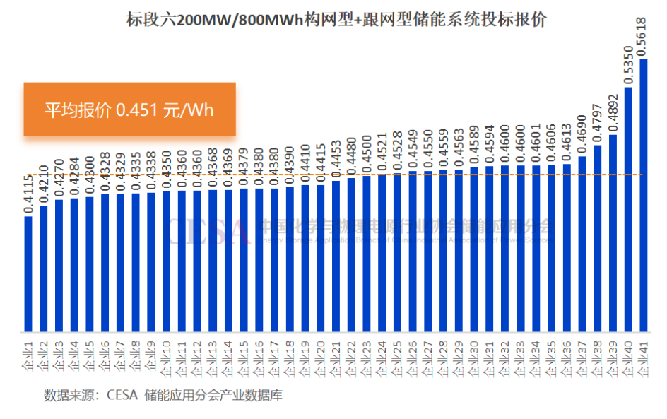 共41家企業(yè)參與競標(biāo),投標(biāo)報價在0.427-0.5618元/Wh區(qū)間內(nèi),均價0.451元/Wh。