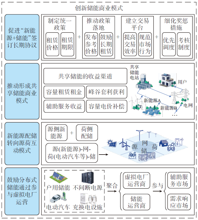 3)創(chuàng)新儲(chǔ)能商業(yè)模式。優(yōu)化政策環(huán)境與市場(chǎng)機(jī)制的同時(shí),還應(yīng)創(chuàng)新與推廣多樣、可持續(xù)商業(yè)模式,促使新型儲(chǔ)能更靈活地融入市場(chǎng),達(dá)成“一體多用、分時(shí)復(fù)用”的目標(biāo)。創(chuàng)新儲(chǔ)能商業(yè)模式的具體方案見(jiàn)圖5。