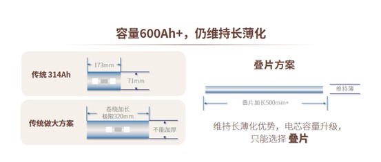 (圖示)這是下一代電芯的大概發(fā)展方向,我們經(jīng)過五六年的時間,正好趕到了下一代電芯的風(fēng)口上,314的時代更多是短刀,疊片在這個尺寸下也沒有什么成本優(yōu)勢,在性能方面是有優(yōu)勢的。在下一代的情況下,電芯向大的情況下怎么辦?只能是變寬,這有一個上限,所以我們一般評估在320毫米左右就到上限了,再往大走,只能用疊片的路線。疊片的路線不太好做,有好多的工藝需要解決,有好多生產(chǎn)過程中的管控問題,我們用了五六年的時間,攻克的大批量的這種問題。