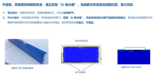 (圖示)這是我們在想的,基于刀片能夠做怎么樣的創(chuàng)新,我們在車端已經(jīng)用了,在兩側(cè)出吉爾的情況下,把防爆閥的方向沖上或者沖下就可以,這樣我們的電和氣不能在熱失控的時候碰到。好多系統(tǒng)設(shè)計上的考量,絕緣等好多的考量,當(dāng)電芯熱失控的時候,好多東西都已經(jīng)失去了它的防護(hù)特性,失去了設(shè)計指標(biāo),所以這是我們覺得最核心的。后面因為長壽命的演變,黃教授做了很多體系方面的研究,我們公司也在做這方面的相應(yīng)應(yīng)用。