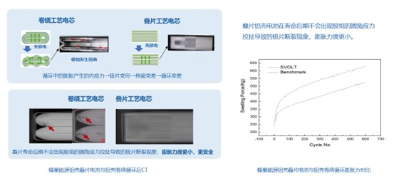 (圖示)疊片和卷繞的區(qū)別,左邊的圖,一個是它的空間利用率,第二個是硬力。右邊的圖是我們做了相應(yīng)循環(huán)之后的CT掃描,左邊是卷繞,兩個機組,在循環(huán)末端幾組有褶皺,邊緣有撕裂,這樣一個是局部發(fā)熱,內(nèi)部析鋰,右邊是整個疊片界面比較良好。