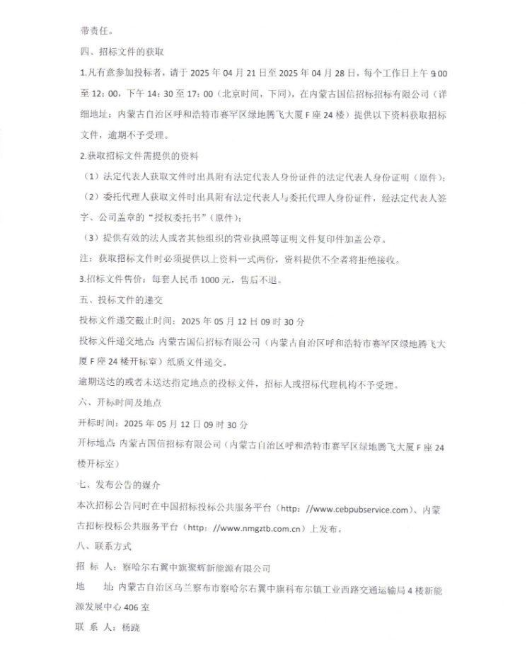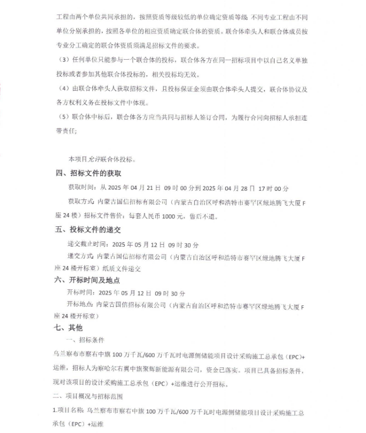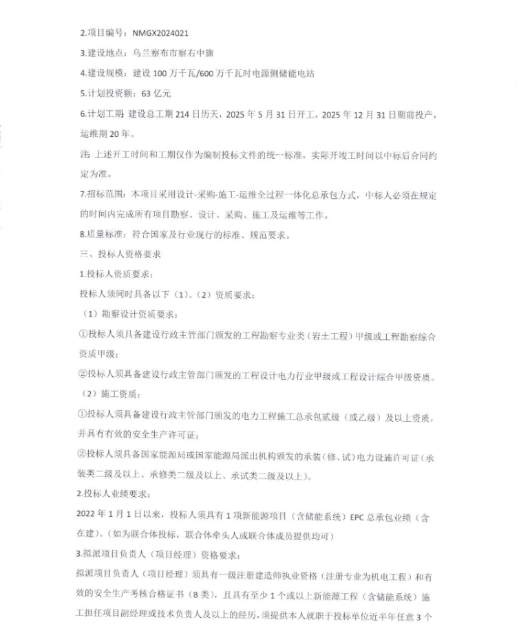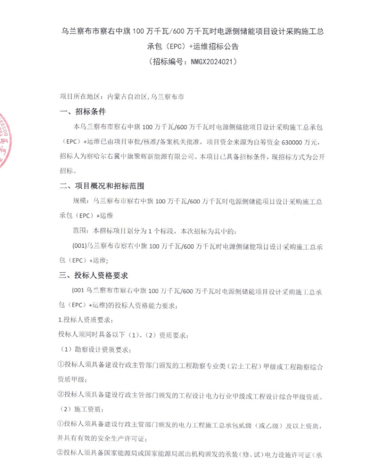 中國儲能網(wǎng)訊:4月21日,察哈爾右翼中旗聚輝新能源有限公司發(fā)布烏蘭察布市察右中旗1GW/6GWh電源側(cè)儲能項目設(shè)計采購施工總承包(EPC)+運維招標(biāo)公告。資金來源為自籌資金63億元,折合單價1.05元/Wh。