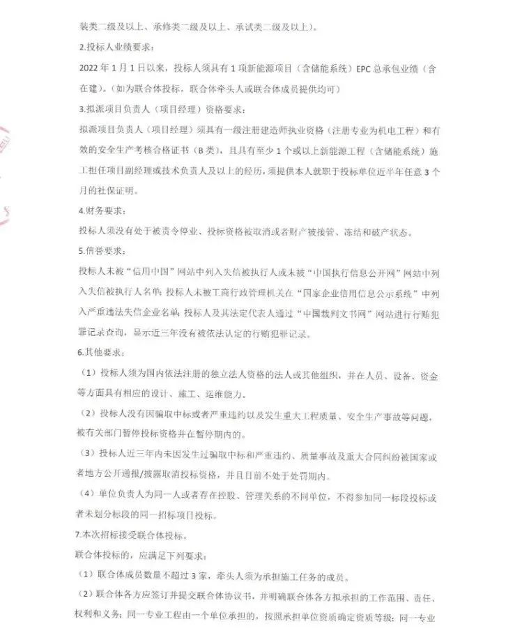 要求投標(biāo)人2022年1月1日以來,須具有1項新能源項目(含儲能系統(tǒng))EPC總承包業(yè)績(含在建)(如為聯(lián)合體投標(biāo),聯(lián)合體牽頭人或聯(lián)合體成員提供均可)。