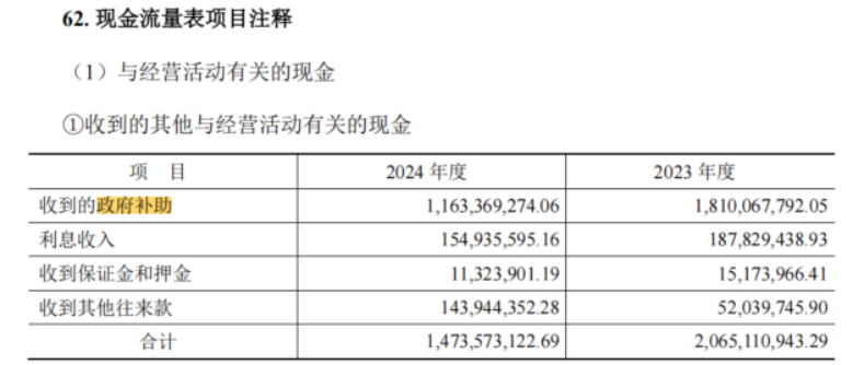 從下表可以看到經(jīng)營(yíng)活動(dòng)收到的政府補(bǔ)助現(xiàn)金為11.63億元,較去年同期減少6.47億元,進(jìn)一步驗(yàn)證了政府補(bǔ)助的收緊趨勢(shì)。