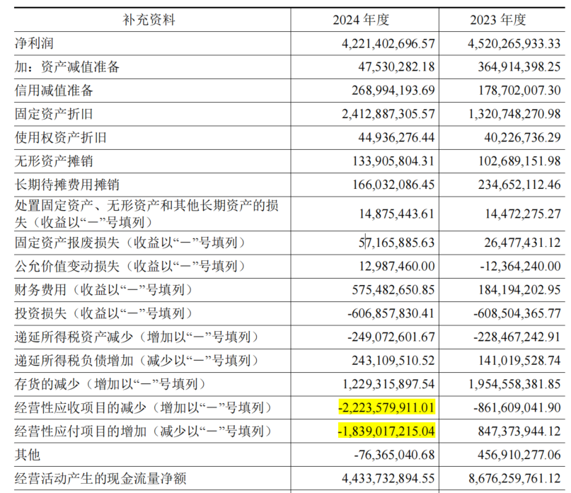 2024年,公司經(jīng)營(yíng)性應(yīng)付項(xiàng)目減少了18.39億元(現(xiàn)金流表中為-18.39億元,負(fù)值表示應(yīng)付款減少,實(shí)際支付現(xiàn)金增加),而2023年該項(xiàng)為增加8.47億元,對(duì)現(xiàn)金流形成正向貢獻(xiàn)。相比之下,2024年該項(xiàng)導(dǎo)致公司多流出現(xiàn)金約26.86億元,顯著加大了經(jīng)營(yíng)活動(dòng)現(xiàn)金流的壓力。造成這一變化的可能原因包括:公司縮短了對(duì)供應(yīng)商的付款周期;報(bào)告期內(nèi)支付票據(jù)到期款;或是公司主動(dòng)優(yōu)化與供應(yīng)商的合作關(guān)系,以換取更有利的采購(gòu)條件,雖然短期現(xiàn)金流承壓,但可能有利于長(zhǎng)期成本控制和供應(yīng)穩(wěn)定性。