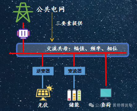 既然提到穩(wěn)定,那就和光伏沒啥關(guān)系了,所以一般此時(shí)的交流母線三要素是由儲(chǔ)能系統(tǒng)來提供的,儲(chǔ)能變流器的工作狀態(tài)就不叫跟網(wǎng)了,而是構(gòu)網(wǎng)。