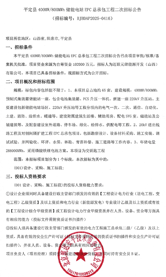 中國儲能網訊:4月22日,邁聯(lián)元儲能源開發(fā)(山西)有限公司開啟平定縣400MW/800MWh儲能電站EPC總承包工程的二次招標工作。該儲能電站項目位于山西省陽泉市平定縣,將建設一座400MW/800MWh預制式集裝箱儲能站,涵蓋電池集裝箱、PCS升壓一體機以及一座新建的220kV升壓站。項目總投資額10.2億元,折合單價為1.275元/Wh。