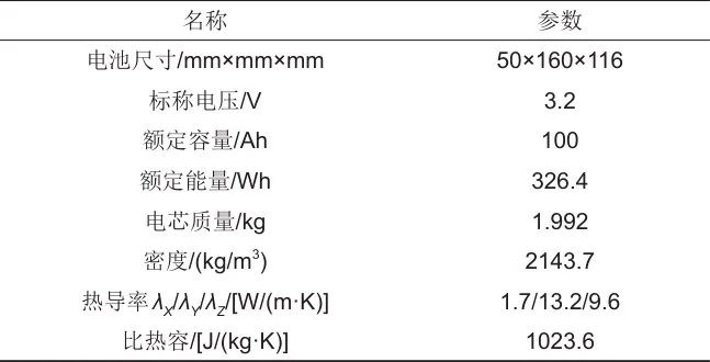 為了建立電池熱模型,需要獲取電池單體的熱物性參數(shù)。以方形磷酸鐵鋰(LFP)電池為對象,文中鋰電池的熱物性參數(shù)通過實驗獲得,根據(jù)文獻[17]的方法得到單體鋰電池各部分的相關參數(shù),電池基本參數(shù)如表1所示。