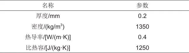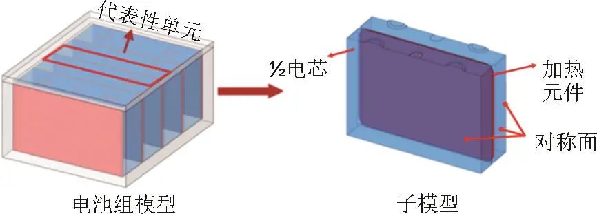 根據(jù)方形電池的對稱性,選擇電池的1/2對稱體積建立模型即可滿足仿真需要。簡化的電池組模型由2個半電池組成,電池大面相對放置,電池側面與剖面均設置為對稱表面。在低溫環(huán)境溫度下,本工作采用加熱膜在短時間內將電池模組加熱至適宜的工作溫度,并確保電池組良好的溫度均勻性,便于后續(xù)的正常充放電行為。加熱膜的基本參數(shù)見表2。根據(jù)加熱膜排布位置,分別在電池大面、側面和底面上粘貼加熱膜,電池模型見圖1。利用穩(wěn)壓電源向加熱膜輸入電信號,加熱膜產(chǎn)生熱量通過熱傳導由電池外表面?zhèn)鬟f至低溫電芯,為電池模組迅速升溫。