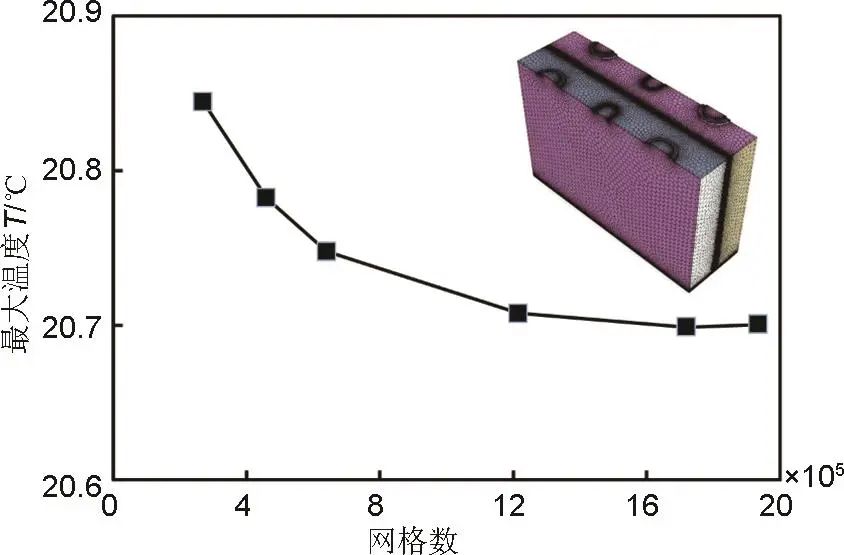 加密網(wǎng)格可以提高仿真計算的準確性。網(wǎng)格尺寸過大會使計算失真,甚至導致結果發(fā)散;網(wǎng)格尺寸過小則會增加計算時間,浪費計算資源。本研究針對電池模型劃分不同網(wǎng)格尺寸,分析了不同數(shù)量的網(wǎng)格對模型計算精度的影響。如圖2所示,當網(wǎng)格數(shù)超過120萬時,電池最大溫度趨于平穩(wěn),因此確定網(wǎng)格模型共計4514415個節(jié)點、1229694個網(wǎng)格單元。