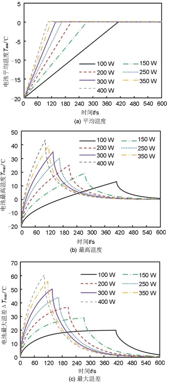 將加熱膜粘貼在電池大面,加熱膜分別輸入不同的電參數(shù),加熱功率從100 W增大到400 W,每組間隔50 W。初始溫度為-20 ℃,設定加熱膜的邊界條件為當電池平均溫度到達0 ℃時,加熱膜加熱功率變?yōu)?,電池的溫升結果如圖3所示。