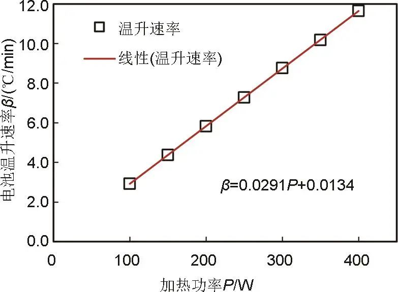 由加熱功率與電池溫升速率的關系(圖4)可發(fā)現(xiàn),電池的溫升速率隨加熱功率的提高呈線性增長趨勢。對于加熱功率350 W及以上,電池加熱后溫差降至3 ℃以內的時間基本相同,說明功率持續(xù)增大對電池均溫的時間影響較小。通過加熱功率與加熱時間的關系,可以計算出不同加熱功率的耗電量均為11.47 Wh左右,故加熱消耗的電量轉化為電池自身的熱量,在不同功率下基本相同,耗電量對加熱速率無直接影響。