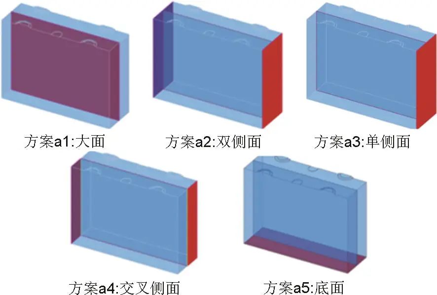 方形鋰電池的熱導率呈現(xiàn)各向異性,在電池的不同方向上使用同一功率加熱,會產(chǎn)生不同的加熱效果。本工作分別采取了5種布置方案(圖5)來加熱電池單體,并觀察電池溫度變化情況。