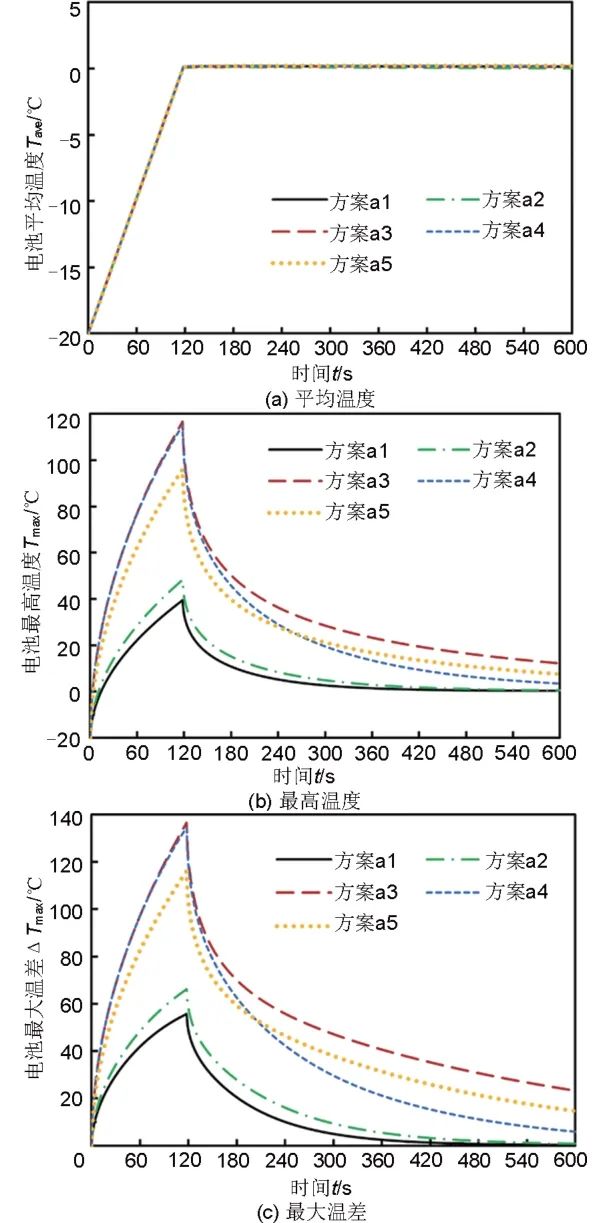 如圖6(a)所示,使用同一功率加熱電池,加熱膜布置方式不同,但電池平均溫度呈現(xiàn)相同的溫升趨勢,線性升溫至0 ℃,之后趨于穩(wěn)定。由圖6(b)、(c)可知,后3種方案最大溫度高于90 ℃,超過電池的正常工作溫度范圍,極大地影響了電池壽命。在相同的加熱功率下,后3種方案的加熱膜功率密度相比前2種方案增大數(shù)倍,短時間內電池傳熱速率比加熱速率慢,使得電池局部溫度激增,溫差升高。僅通過大面加熱的方案a1,電池的最高溫度和最大溫差分別控制在39.4 ℃和55.7 ℃以內,電池的低溫加熱性能最優(yōu)。其次,通過雙側面加熱的方案a2加熱電池,其電池的最高溫度和最大溫差與大面加熱方案相比提高了18%。但雙側面加熱方案與大面所使用的加熱膜相比,表面材料成本減少了38%。