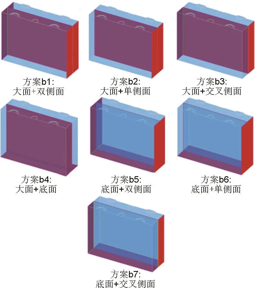 對第2.2節(jié)不同的加熱膜布置方式進行組合,共采取了7種加熱膜組合加熱方案,具體方案詳情如圖7所示,分析加熱膜多維度協(xié)同加熱對電池溫升效果的影響。
