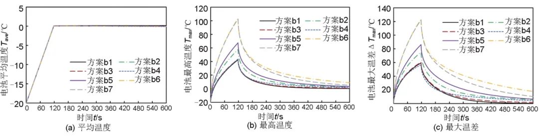 采用加熱膜多維度協(xié)同加熱方案時,加熱膜的功率相同,電池平均溫度變化一致,表明加熱膜的布置方式對電池總體傳熱情況的影響較小。圖8(b)(c)表明,方案b1、b3、b4的電池最高溫度和溫升曲線上升趨勢最平緩,最高溫度在42 ℃以內,該3組方案的加熱效果最佳。其中方案b6與b7加熱效果最差,溫升曲線基本相同,電池最高溫度達到104 ℃左右。此外,對比圖8(c)電池最大溫差的變化,方案b4的溫差在加熱118 s停止后,電池經(jīng)過熱量傳遞,最大溫差仍在5 ℃以上,影響電池的使用性能。綜上,方案b1和方案b3的加熱效果更優(yōu)。