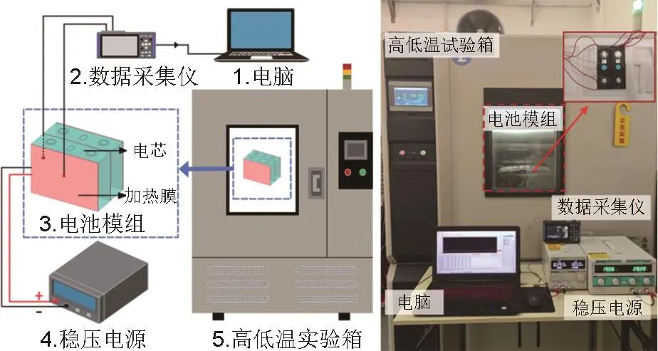 電池低溫加熱測試系統(tǒng)主要包含上位機、數(shù)據(jù)采集儀、電池模組、穩(wěn)壓電源和高低溫試驗箱等設備,系統(tǒng)示意圖見圖9。本實驗對象為100 Ah的鋰離子電池,開展電池低溫加熱實驗時,電池組四周及底部用氣凝膠氈與珍珠棉組成的保溫隔熱材料包裹,電池模組大面或側面上分別布置0.2 mm的加熱膜。