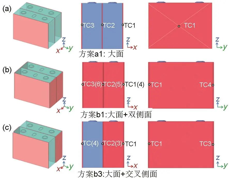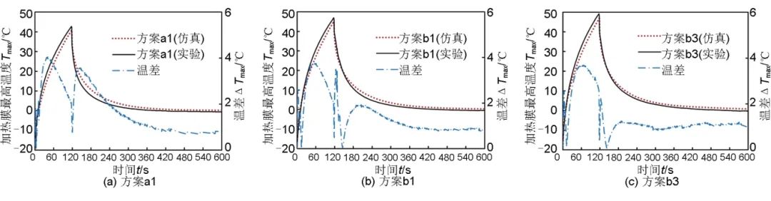 選用第2節(jié)中加熱效果良好的3種加熱膜布置方式(方案a1、方案b1和方案b3)開展實驗,對仿真結果進行驗證。為保證-20 ℃的低溫實驗環(huán)境條件,將電池模組放入高低溫試驗箱中靜置24 h均溫,待電池內外溫度保持穩(wěn)定時開展實驗。