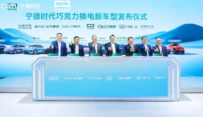 中國儲能網(wǎng)訊:4月23日,在第21屆上海國際汽車工業(yè)展覽會上,動力電池巨頭寧德時代(300750.SZ)舉辦巧克力換電新車型發(fā)布儀式,與一汽、長安、北汽、奇瑞、廣汽五大車企共同發(fā)布10款巧克力換電新車型。