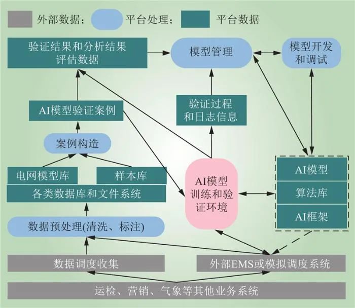 3)可靈活支持開發(fā)訓(xùn)練、驗(yàn)證推理環(huán)境需求,以及離線、仿真在線、運(yùn)行系統(tǒng)在線驗(yàn)證模式。訓(xùn)練環(huán)境和推理環(huán)境無(wú)本質(zhì)不同,只是前者要求的配置較完整,以提供全過(guò)程支持,后者則可輕量化部署,側(cè)重于以(接近)實(shí)際場(chǎng)景獲取AI模型的功能、性能驗(yàn)證數(shù)據(jù)。對(duì)于類似在線驗(yàn)證的需求,可通過(guò)引入電網(wǎng)仿真器、接入在線運(yùn)行系統(tǒng)等方式實(shí)現(xiàn)。