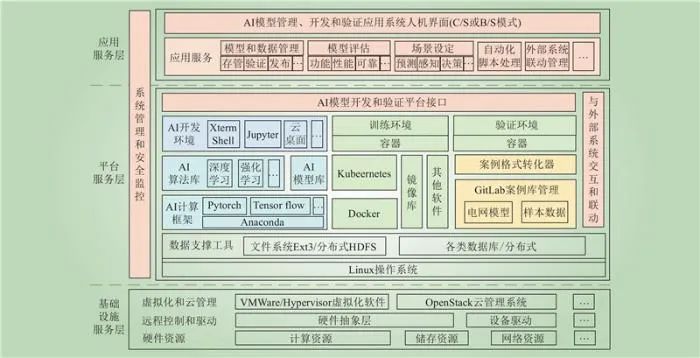 平臺(tái)服務(wù)層:在IaaS服務(wù)的基礎(chǔ)上,實(shí)現(xiàn)對(duì)各類AI框架和算法的支持和管理、對(duì)各種場(chǎng)景下驗(yàn)證案例(包含電網(wǎng)模型和樣本數(shù)據(jù))的管理,然后通過(guò)基于容器和鏡像的動(dòng)態(tài)環(huán)境構(gòu)建,對(duì)上層提供AI模型訓(xùn)練和驗(yàn)證服務(wù)。