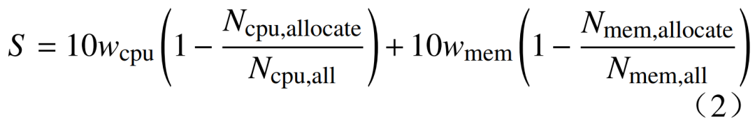 式中:S∈[0,10],為某節(jié)點(diǎn)的資源優(yōu)先級(jí);wcpu、wmem分別為計(jì)算資源、內(nèi)存資源所占權(quán)重,通常wcpu=wmem,均取值0.5;Ncpu,allocate、Ncpu,all分別為該節(jié)點(diǎn)上已分配的計(jì)算資源和計(jì)算資源總量;Nmem,allocate、Nmem,all分別為該節(jié)點(diǎn)已分配的內(nèi)存資源和內(nèi)存總量。