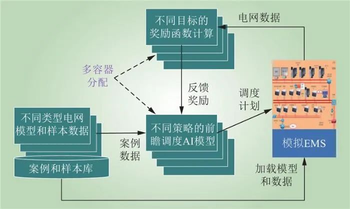 1)解耦了樣本數(shù)據(jù)與AI模型的關(guān)聯(lián)性。所有案例都來(lái)自統(tǒng)一的案例樣本庫(kù),只是根據(jù)需求分別進(jìn)行了抽取和再組織。2)適應(yīng)了AI模型對(duì)框架的依賴。對(duì)不同的AI開發(fā)框架,能夠直接在平臺(tái)上或者基于鏡像的容器環(huán)境中得到支持。3)能夠輸入多種電網(wǎng)拓?fù)洹l(fā)用電曲線、災(zāi)害事件場(chǎng)景案例,對(duì)AI模型的訓(xùn)練、驗(yàn)證和遷移學(xué)習(xí)提供充分支撐。4)通過(guò)不同的容器化部署,能夠并行化進(jìn)行各種機(jī)器學(xué)習(xí)算法、多種調(diào)度目標(biāo)獎(jiǎng)勵(lì)函數(shù)的驗(yàn)證和比較。