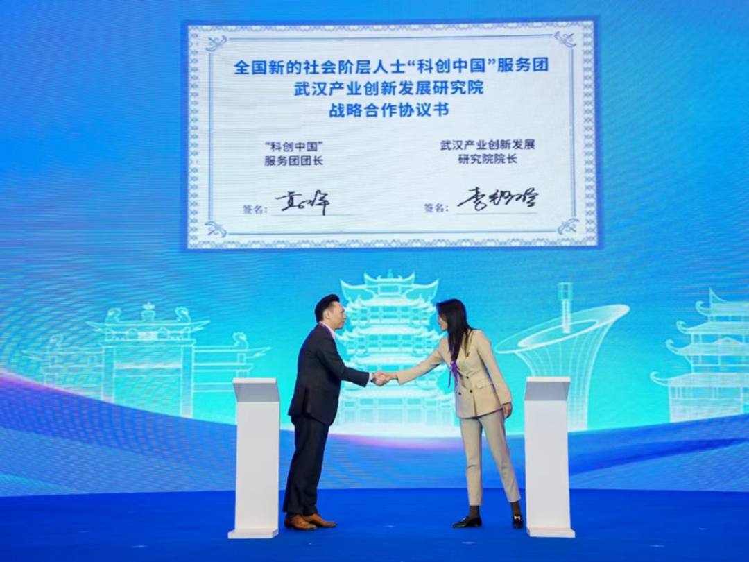 ▲ 啟動(dòng)儀式上,葛群代表新的社會(huì)階層人士“科創(chuàng)中國(guó)”服務(wù)團(tuán)與武漢產(chǎn)業(yè)創(chuàng)新發(fā)展研究院簽署戰(zhàn)略合作協(xié)議