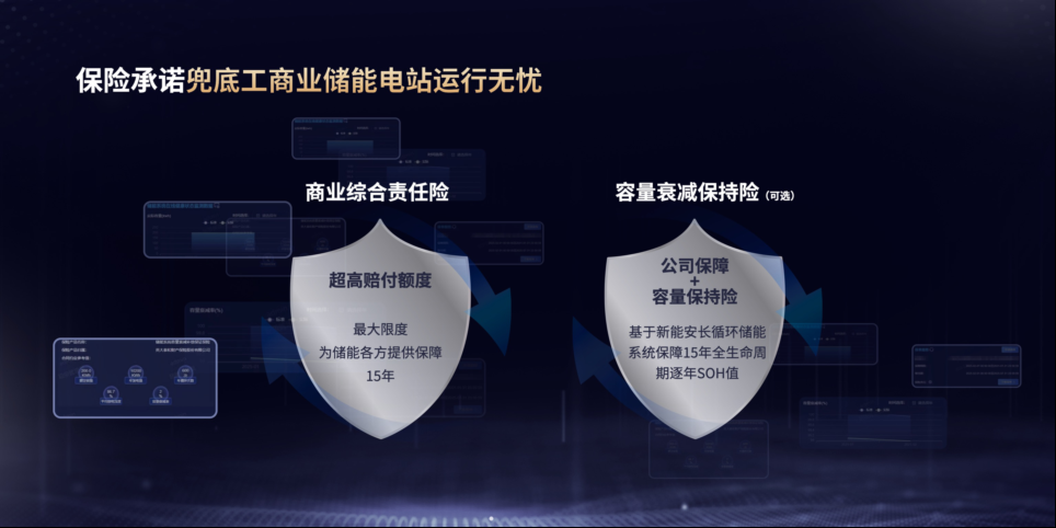 新能安為客戶提供商業(yè)綜合責任險,基于超高的賠付額度,為電站全生命周期運行賦予超額保障。并且,聯(lián)動國網(wǎng)英大集團推出“容量衰減保持險”,基于新能安長循環(huán)儲能系統(tǒng),對電站15年全生命周期運行中的逐年SOH進行質(zhì)保,極大提升了電站全生命周期保險保障以及可交易性的能力。