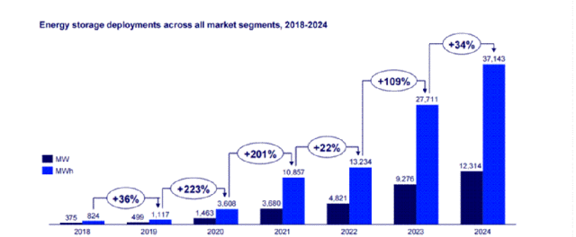 截至2024年底,美國新增儲能裝機(jī)37.143Gwh,按照裝機(jī)功率和容量,同比增長32.8%和34%。