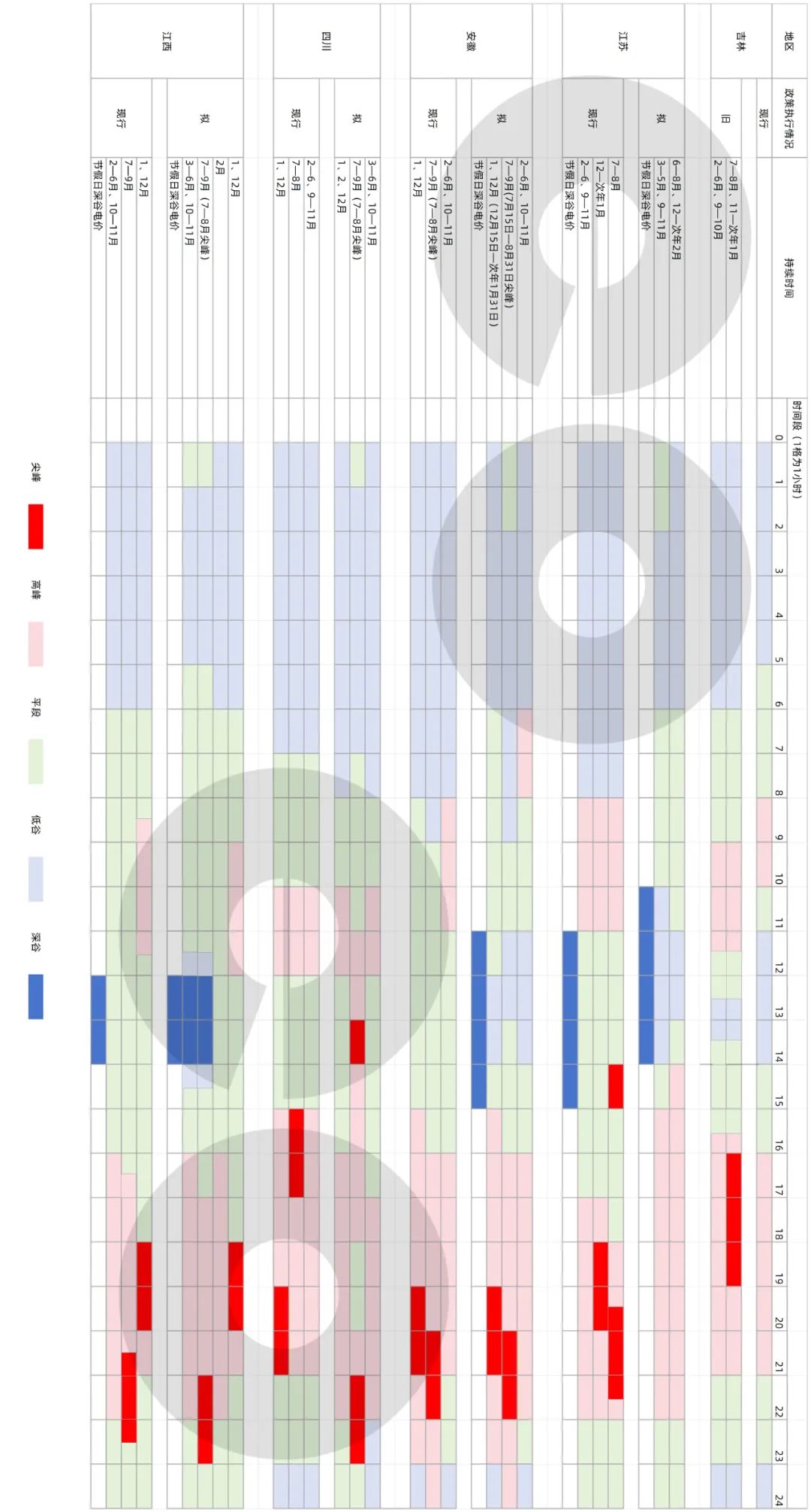 在午間低谷電價(jià)執(zhí)行范圍擴(kuò)大的同時(shí),部分省份的尖峰電價(jià)執(zhí)行力度有所減弱。吉林由此前在夏冬季5個(gè)月的16—19點(diǎn)固定實(shí)行尖峰電價(jià)調(diào)整為根據(jù)電力供需情況靈活啟動(dòng)。安徽擬將實(shí)行尖峰電價(jià)的時(shí)間,由現(xiàn)行的夏冬季各兩個(gè)月調(diào)整為各一個(gè)半月。四川擬取消冬季尖峰電價(jià),將夏季尖峰電價(jià)的時(shí)長(zhǎng)由2小時(shí)調(diào)整為3小時(shí),并計(jì)劃建立靈活執(zhí)行機(jī)制,其他月份日最高氣溫大于等于35℃時(shí)啟動(dòng)尖峰電價(jià)。江西則計(jì)劃恢復(fù)此前暫緩執(zhí)行的尖峰電價(jià),并將執(zhí)行月份減少1個(gè)月。