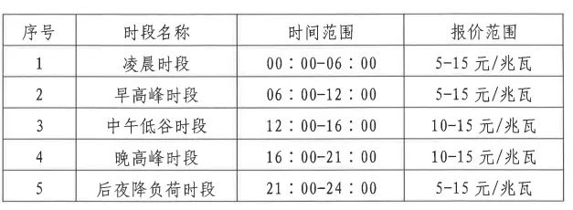申報(bào)價(jià)格分為5個(gè)時(shí)段,分別是00:00-06:00報(bào)價(jià)范圍5-15元/兆瓦,06:00-12:00報(bào)價(jià)范圍為5-15元/兆瓦,12:00-16:00報(bào)價(jià)范圍為10-15元/兆瓦,16:00-21:00報(bào)價(jià)范圍為10-15元/兆瓦,21:00-24:00報(bào)價(jià)范圍為5-15元/兆瓦。