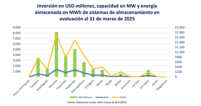 截至2025年3月31日,智利全國范圍內(nèi)共37個儲能項目正在接受智利環(huán)境影響評估局(SEIA)的環(huán)境評估,總規(guī)模高達6.321GW/31.768GWh,計劃總投資65.77億美元(折合人民幣478.41億元),阿塔卡馬和瓦爾帕萊索地區(qū)規(guī)模最大,投資最高。