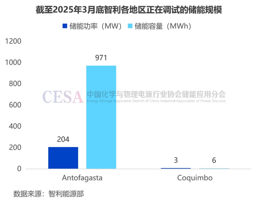 截至2025年3月31日,智利共有4個鋰電池儲能項目正在進行調(diào)試,總規(guī)模達207MW/977MWh,其中204MW/971MWh項目位于安托法加斯塔,占比99%。