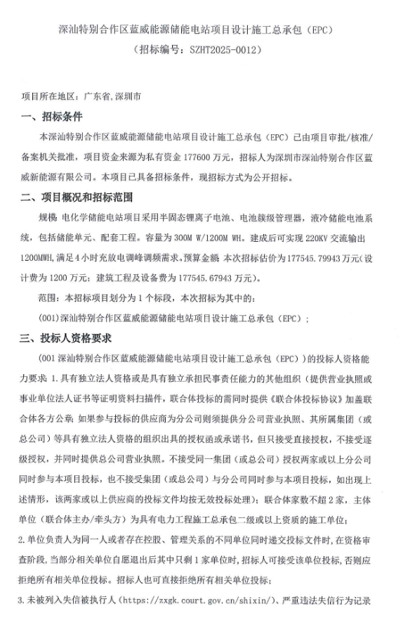 本招標(biāo)項(xiàng)目劃分為1個(gè)標(biāo)段,本次招標(biāo)為其中的(001)深汕特別合作區(qū)藍(lán)威能源儲能電站項(xiàng)目設(shè)計(jì)施工總承包(EPC)。