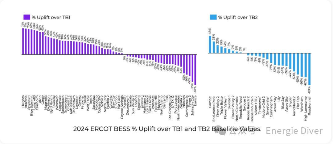 此圖比較了所有1小時(shí)和2小時(shí)電池的TB1和TB2提升。請(qǐng)注意,TB1往往顯示更多的正提升,因?yàn)?小時(shí)電池相較于TB1基線的輔助服務(wù)收入高于2小時(shí)電池相較于TB2基線的輔助服務(wù)收入。因此,1小時(shí)和2小時(shí)BESS在提升上不可直接比較。但在每個(gè)持續(xù)時(shí)間組內(nèi),性能差異很大。