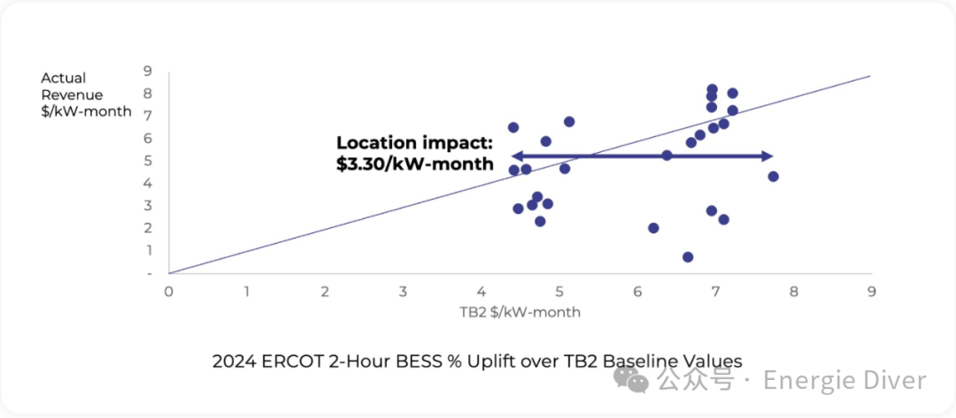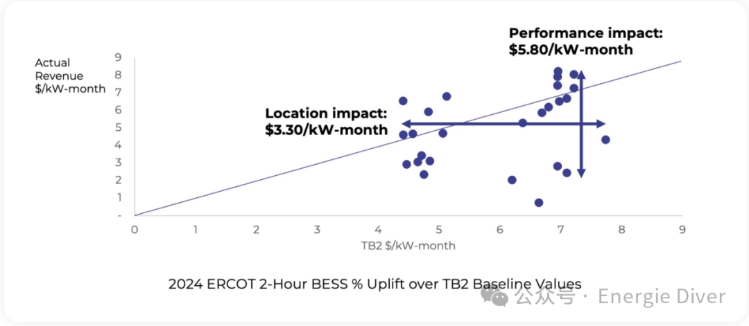 聚焦于2小時(shí)儲(chǔ)能系統(tǒng),我們可以使用TB2基線來評(píng)估各運(yùn)營商的投標(biāo)策略優(yōu)化相對(duì)于位置的性能。我們將每個(gè)電池的特定位置TB2基線(X軸)與2024年實(shí)現(xiàn)的實(shí)際系統(tǒng)收入(Y軸)進(jìn)行繪圖。