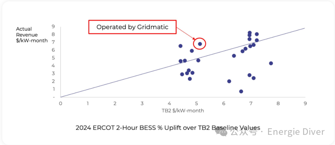 在我們的案例中,我們2024年全年運(yùn)營的一個(gè)電池在總收入中排名第六,但在TB2性能中排名第二。其性能代表相較于ERCOT中BESS加權(quán)平均收入的48%提升,展示了人工智能優(yōu)化在最大化電池儲(chǔ)能回報(bào)方面的影響,無論位置如何。