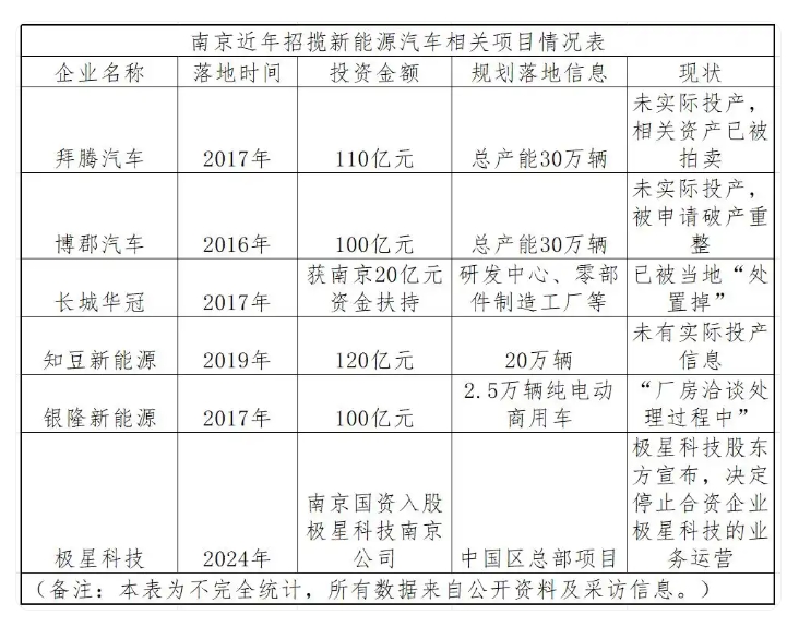 無(wú)獨(dú)有偶,據(jù)不完全統(tǒng)計(jì),包括拜騰汽車(chē)在內(nèi),自2016—2025年的9年時(shí)間內(nèi),南京招攬的博郡汽車(chē)、長(zhǎng)城華冠(備注:其為造車(chē)新勢(shì)力前途汽車(chē)母公司)、知豆新能源、銀隆新能源等5家新能源汽車(chē)明星項(xiàng)目,或破產(chǎn)或停擺。