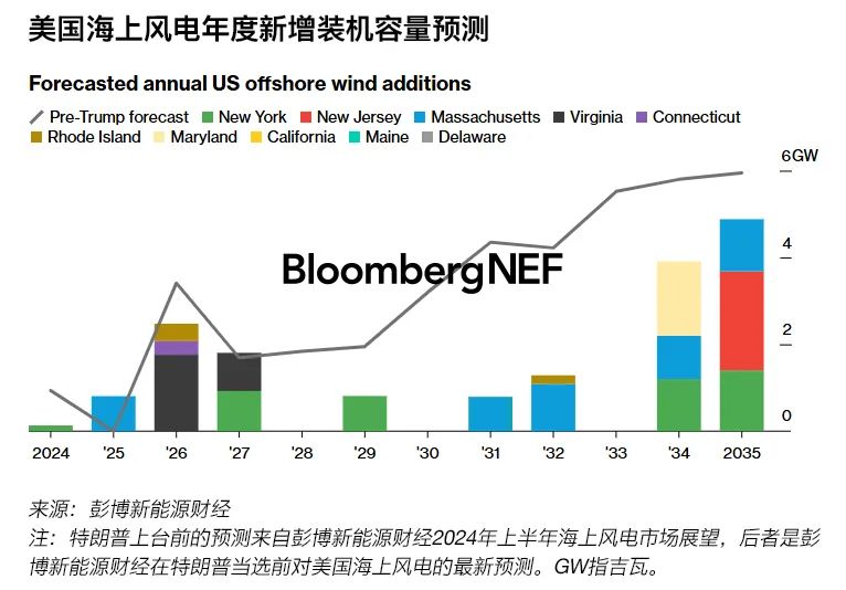 彭博新能源財(cái)經(jīng)對美國到2035年海上風(fēng)電裝機(jī)容量的預(yù)測較特朗普當(dāng)選前下降56%。彭博新能源財(cái)經(jīng)預(yù)計(jì),5.7GW在建項(xiàng)目將繼續(xù)推進(jìn),但那些處于早期開發(fā)階段的項(xiàng)目面臨延遲甚至取消風(fēng)險(xiǎn)。