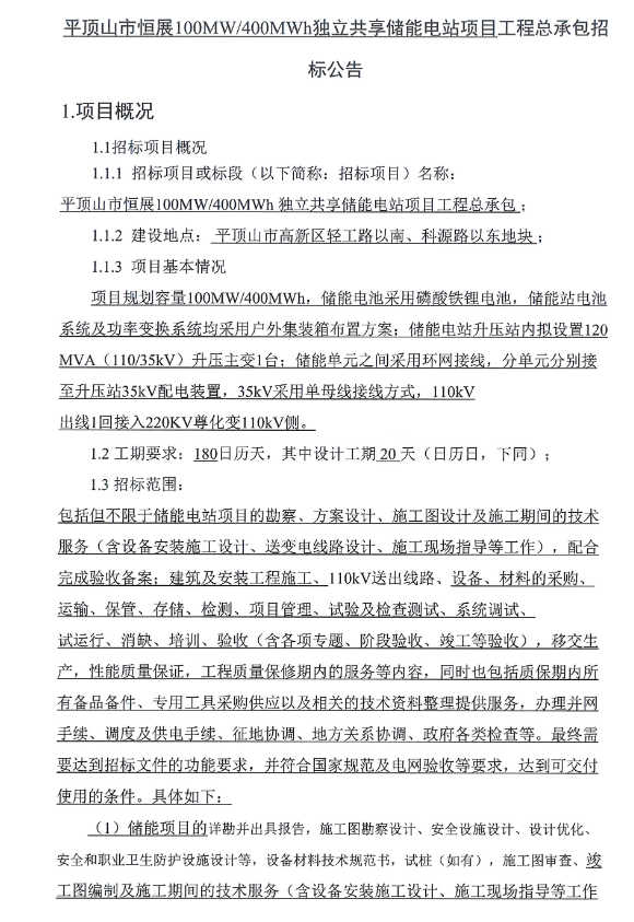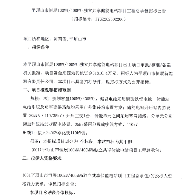 中國儲能網(wǎng)訊:5月12日,平頂山市恒展新能源有限責(zé)任公司發(fā)布100MW/400MWh獨立共享儲能電站項目工程總承包招標(biāo)公告,項目資金為51316.4萬元,約合1.28元/Wh,項目所在地為河南平頂山。