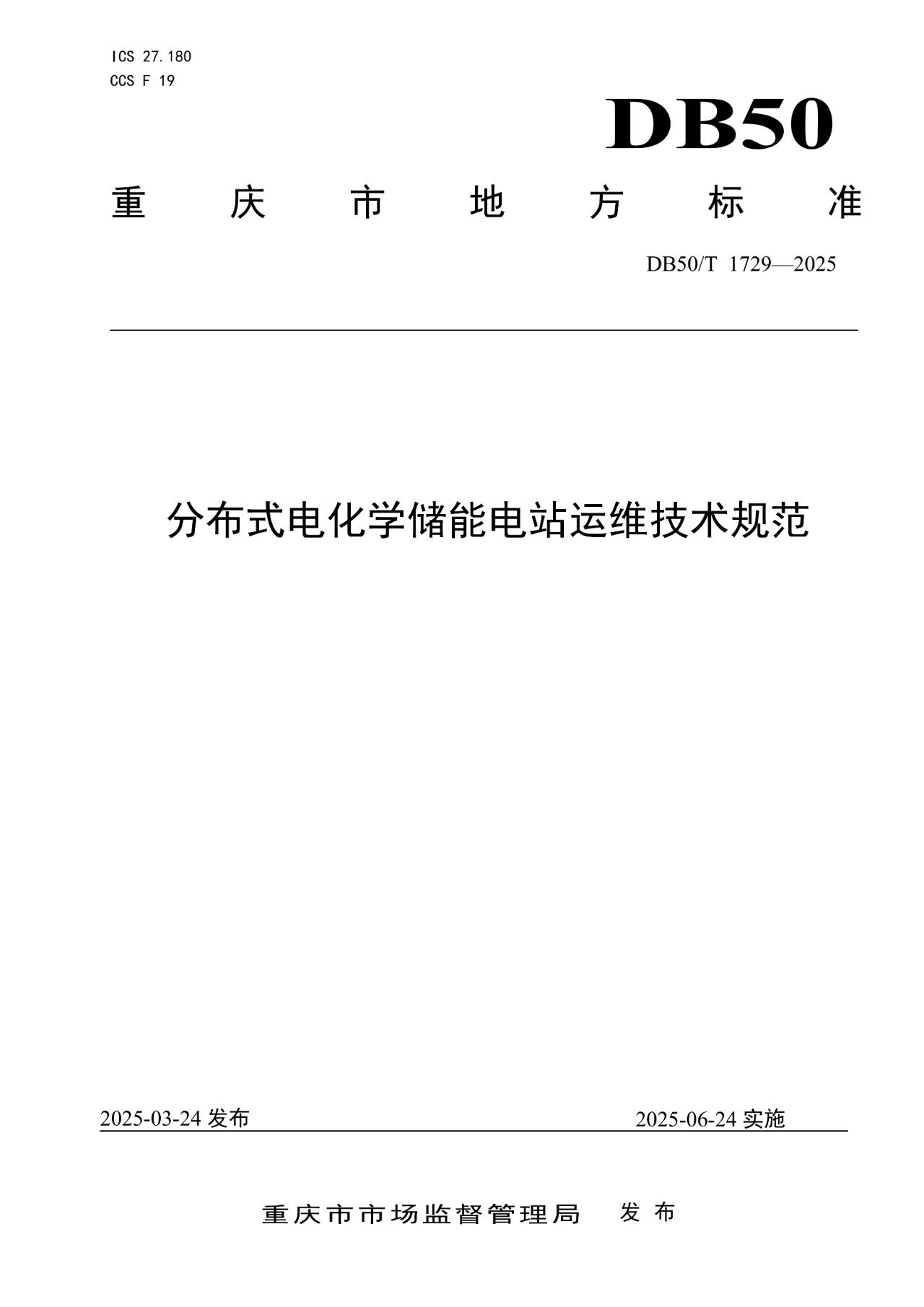 中國(guó)儲(chǔ)能網(wǎng)訊:近日,重慶市首個(gè)儲(chǔ)能地方標(biāo)準(zhǔn)——DB50/T 1729—2025《分布式電化學(xué)儲(chǔ)能電站運(yùn)維技術(shù)規(guī)范》正式由重慶市市場(chǎng)監(jiān)督管理局發(fā)布,并將于2025年6月24日起施行。