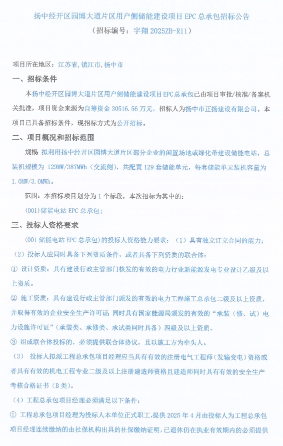 中國儲能網(wǎng)訊:5月16日,揚中市正揚建設有限公司發(fā)布了揚中經(jīng)開區(qū)園博大道片區(qū)用戶側(cè)儲能建設項目EPC總承包招標公告,項目位于江蘇省鎮(zhèn)江市揚中市,擬利用揚中經(jīng)開區(qū)園博大道片區(qū)部分企業(yè)的閑置場地或綠化帶建設儲能電站,總裝機規(guī)模為 129MW/387MWh(交流側(cè)),共配置 129 套儲能單元,每套儲能單元裝機容量為1MW/3MWh。